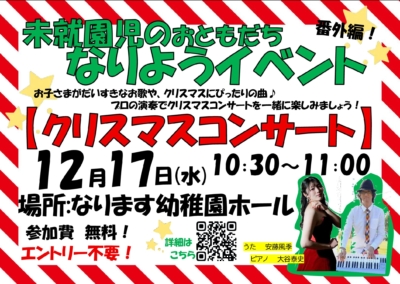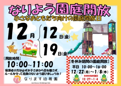 2025.12.02 New!R7年度 番外編 なりようイベント12月『クリスマスコンサート★』 2025.11.21 New!R7年度 なりようルーム♪12月 2025.11.20 New!R7年度 なりよう園庭開放12月 2025.09.11 New!令和8年度入園対象者向け 願書配布開始しました 2025.09.10 New!1歳児親子プレ教室ひよこクラス【後期】募集についてのご案内