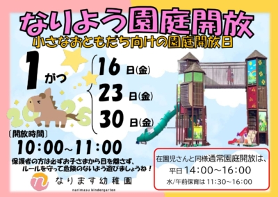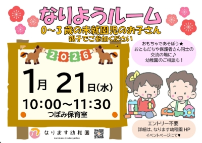 2025.12.26 令和8年度 1歳児/2歳児未就園児クラスについてのご案内 2025.12.19 New!R7年度 園庭開放〔冬休み期間〕 2025.12.19 New!R7年度 なりよう園庭開放1月 2025.12.19 New!R7年度 なりようルーム♪1月 2025.09.11 New!令和8年度入園対象者向け 願書配布開始しました 2025.09.10 New!1歳児親子プレ教室ひよこクラス【後期】募集についてのご案内